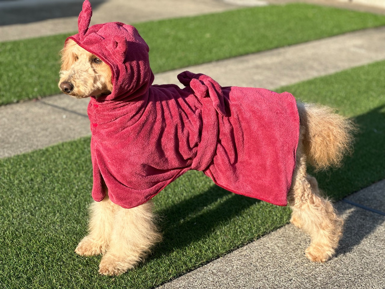 被せるだけのかんたんなバスローブ、バサバサッと拭いてお腹のリボンを結んで下さい。
