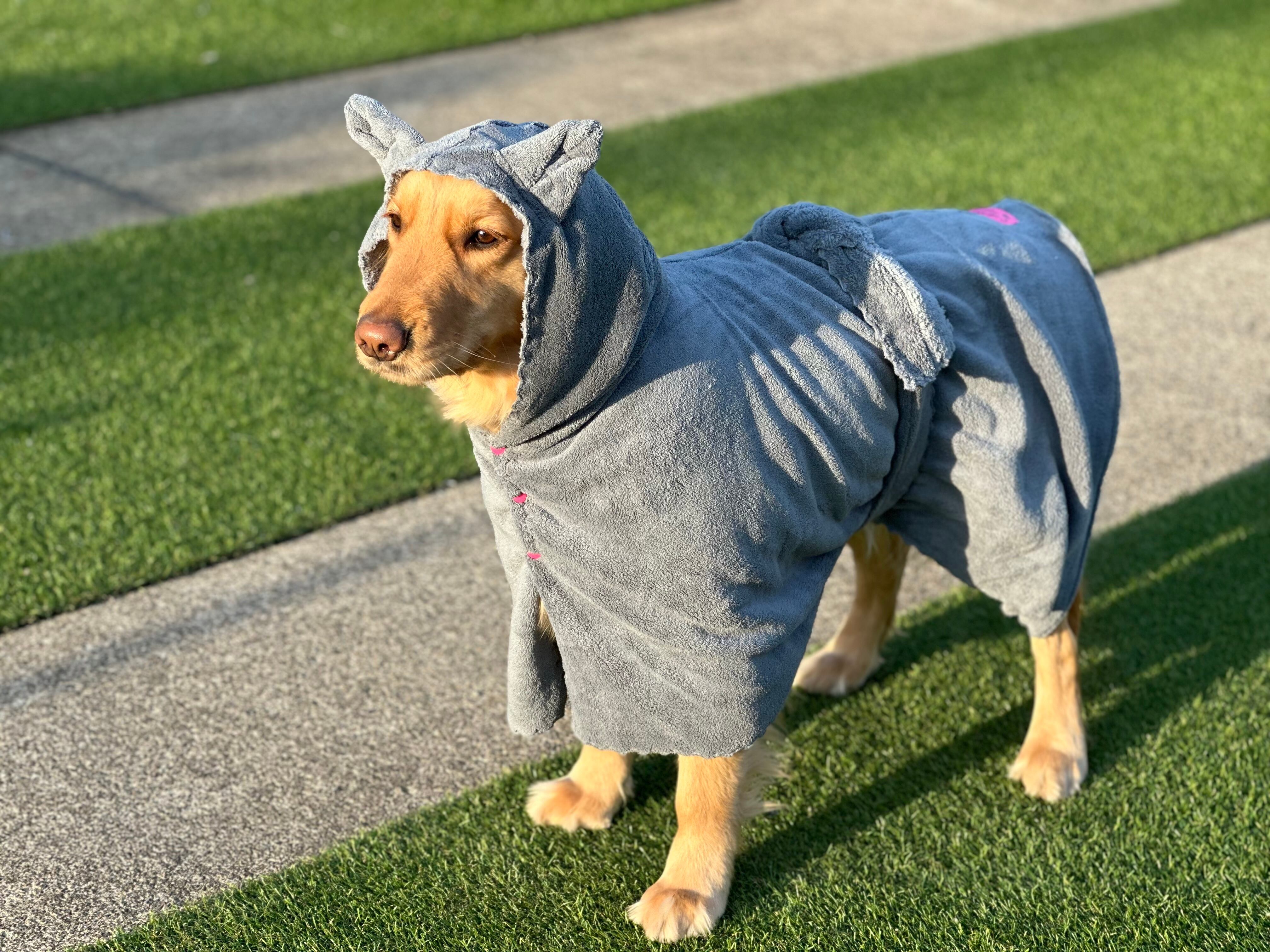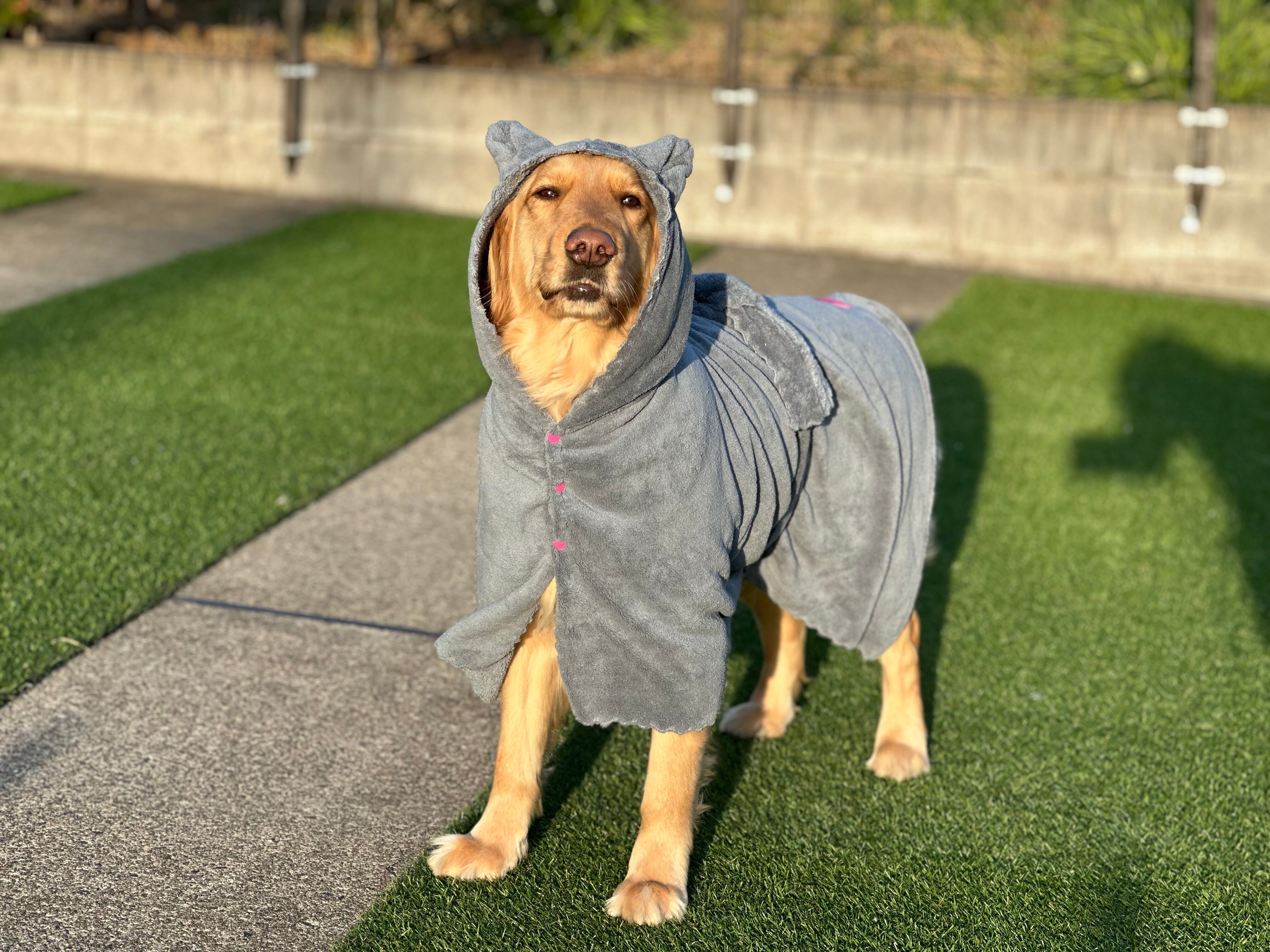 被せるだけのかんたんなバスローブ、バサッと拭いて着せたらお腹のリボンを結んで下さい。