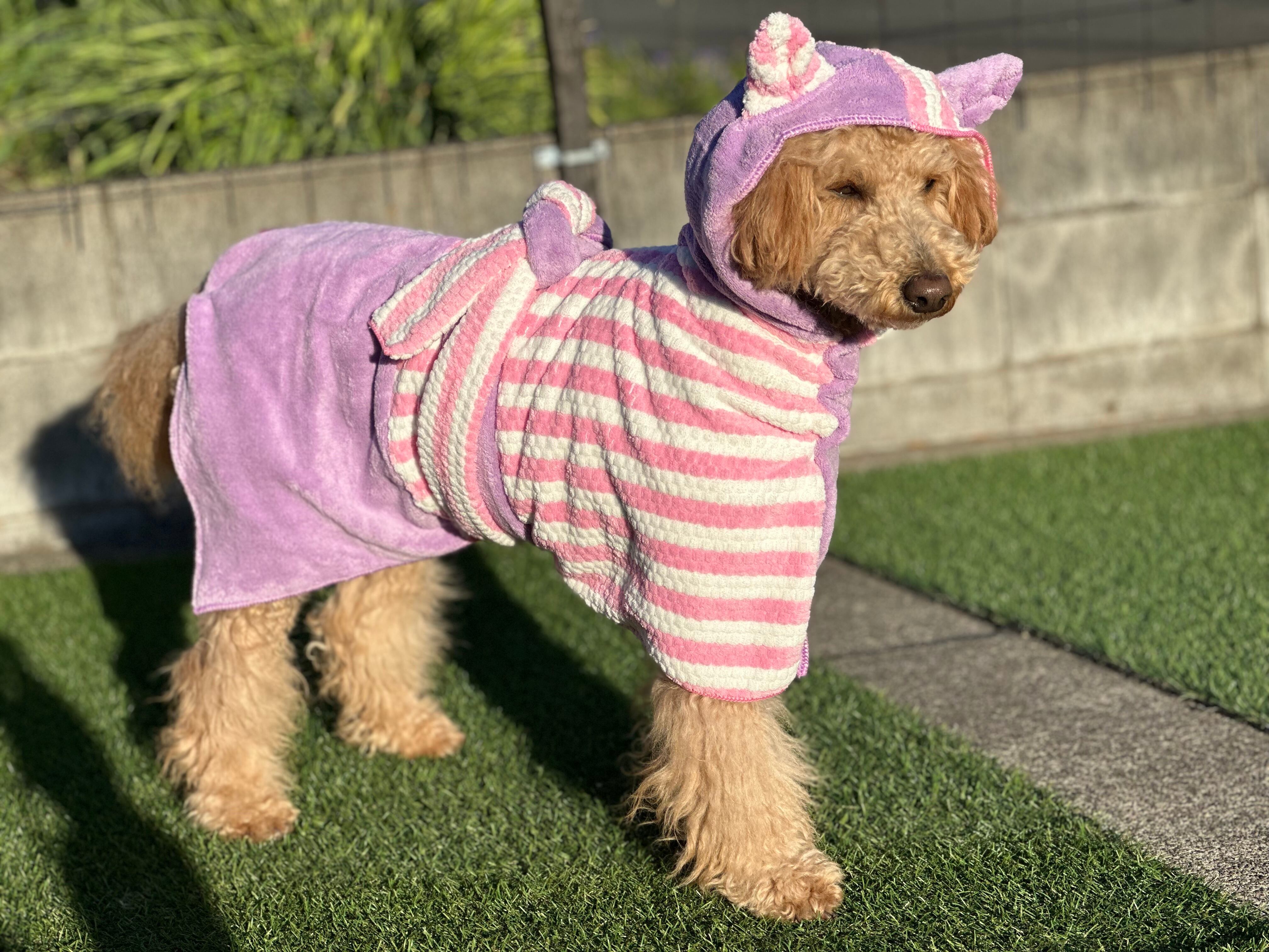 被せるだけのかんたんなバスローブ、バサバサッと拭いてお腹のリボンを結んで下さい。